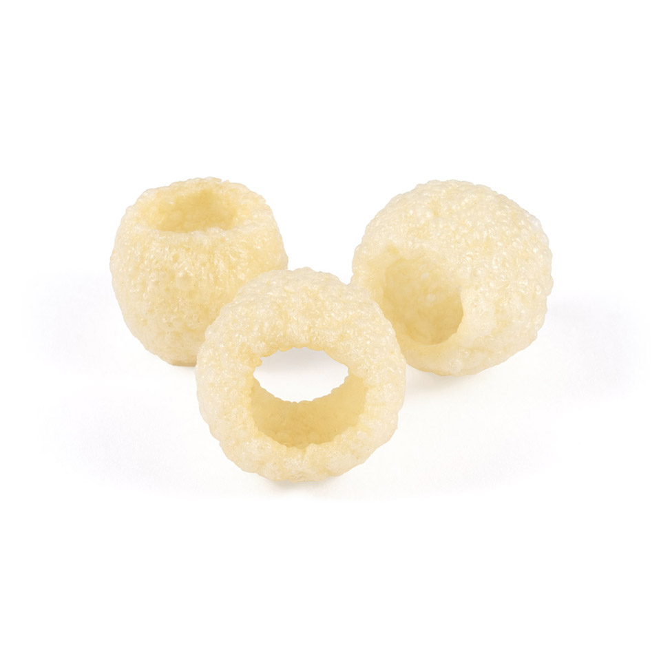 Yellow wheat tube-shaped pellets, available in a low-salt option for a healthier, crispy snack experience.